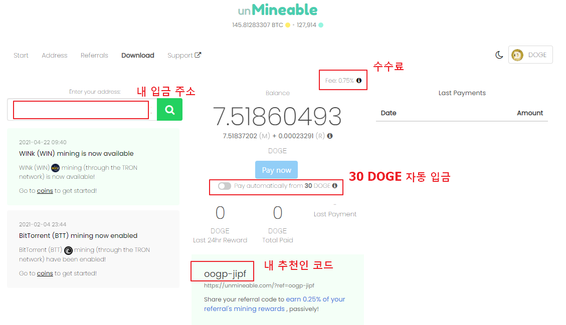 추천인 입력시 0.75%는 개발자에게 가는 수수료 + 0.25%는 추천인에게 가는 수수료입니다.