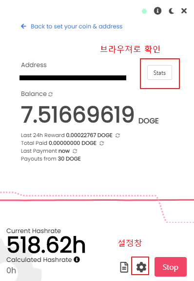 "자동입금" 설정시에는 30 DOGE 채굴시 자동 입금이 됩니다.