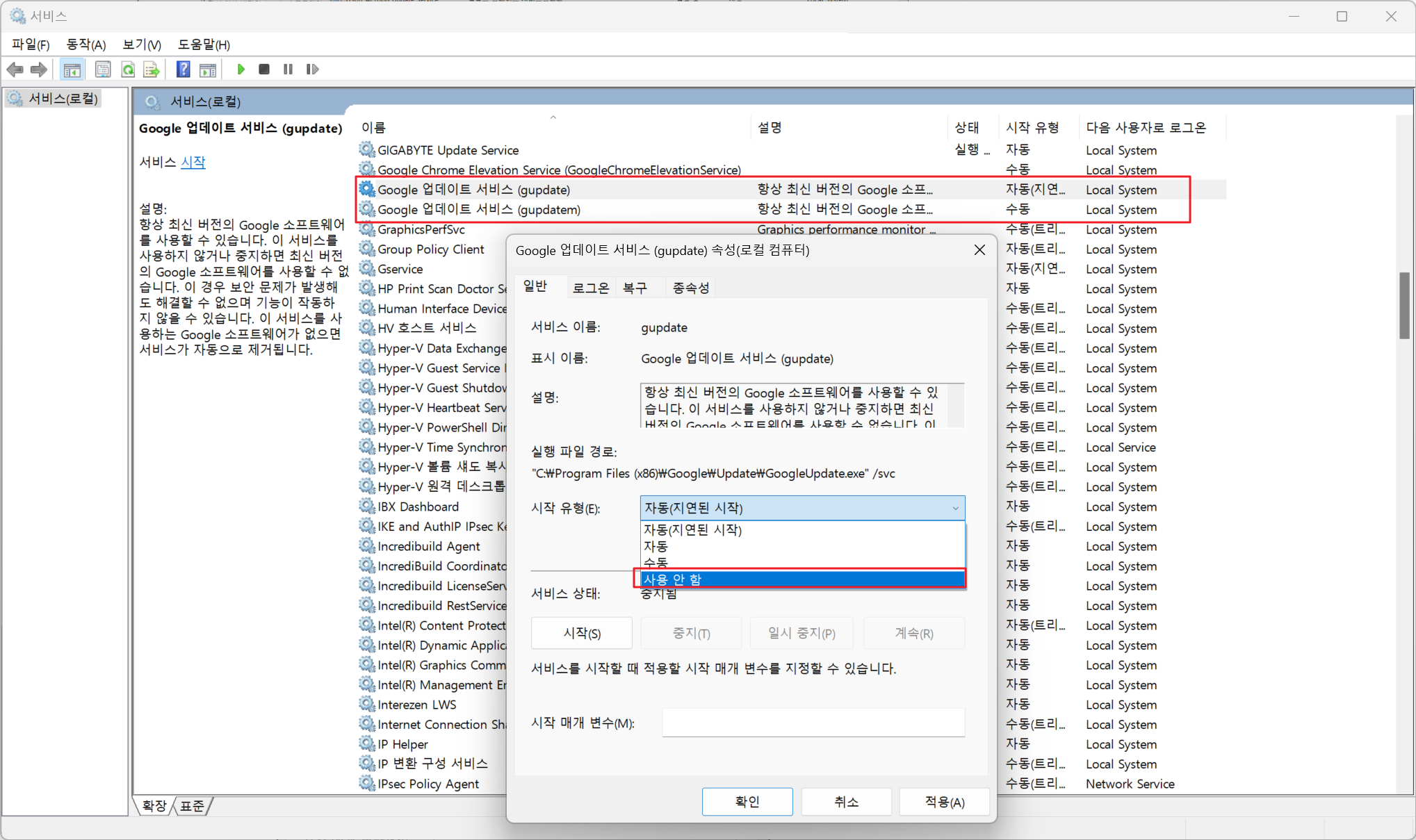 서비스창에서 "Google 업데이트" 2개를 더블클릭 후 시작유형을 "사용안함"으로 설정