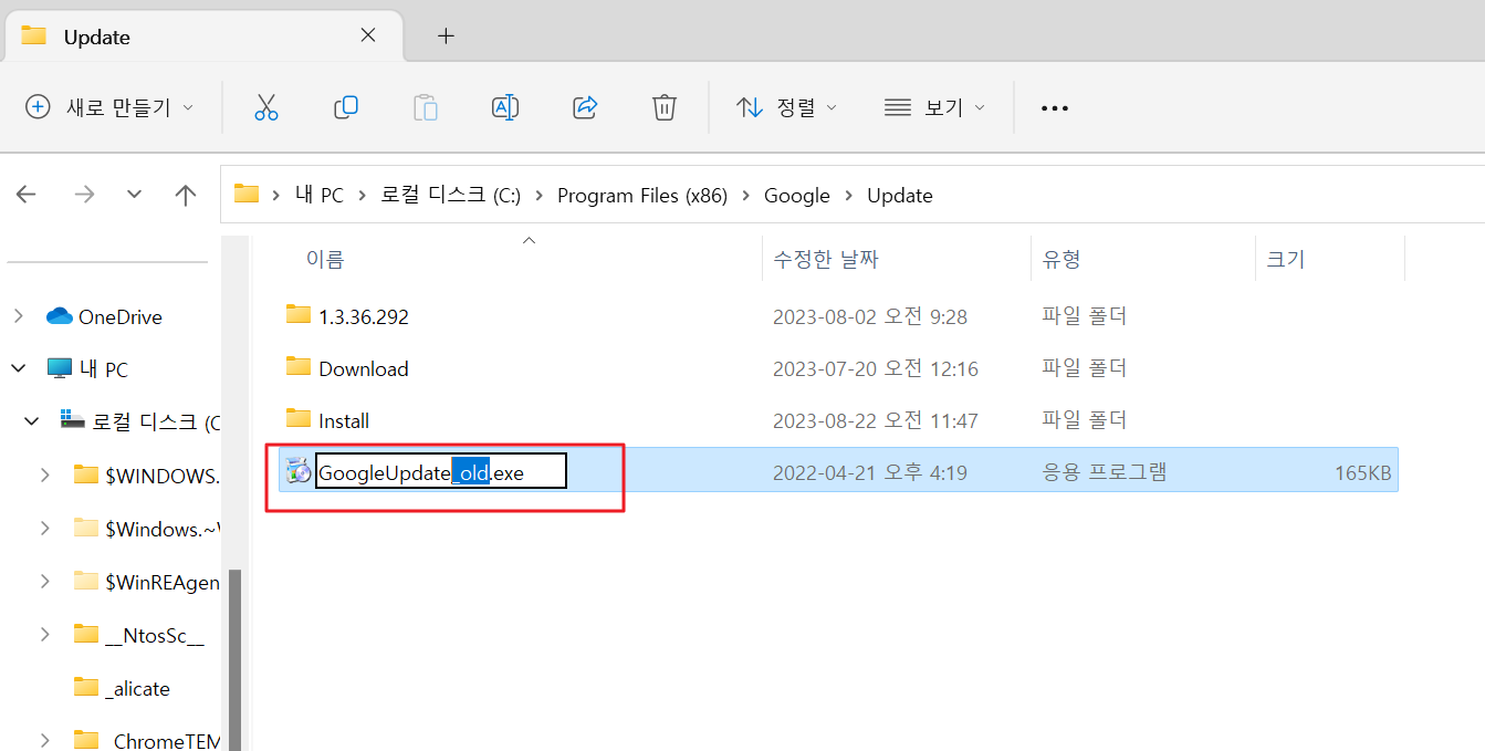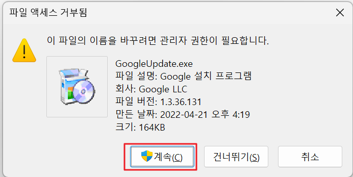 위 경로에서 "GoogleUpdate.exe" 파일의 파일명을 변경해서 업데이트 파일을 찾지 못하게 한다.